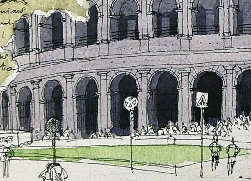 I drew it in June 2000, while staying at the British School in Rome. I was tracing the footsteps of Sigeric, a Bishop who travelled to Rome in 994 to be made Archbishop by the Pope. He left a list of his stopping places along the way from Canterbury, and then a list of the churches he visited in Rome. He didn't mention the Colosseum but could not have failed to see it - together with the Pantheon it is one of the most remarkable and powerful physical memories of the might of Rome.